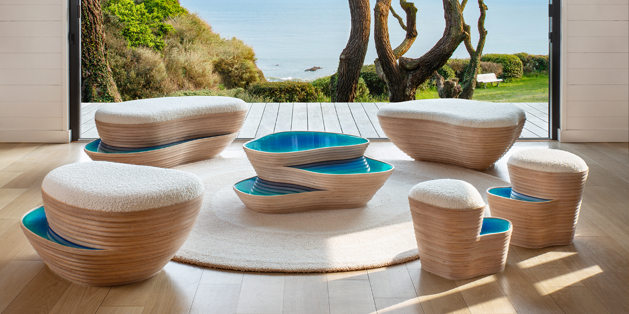 Vos collections — dont Les Glénan présentée dans votre catalogue, mêlant contreplaqué de bouleau, résine colorée et formes organiques — témoignent d’un langage très affirmé. Comment ce vocabulaire formel a-t-il émergé ?