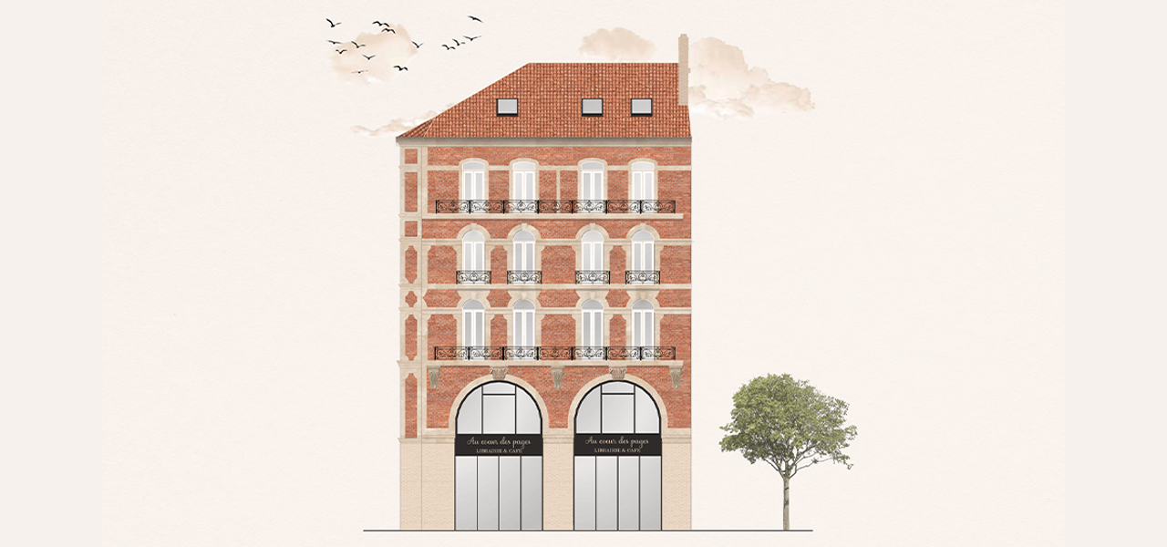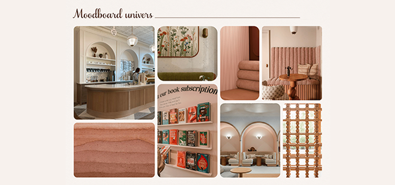 "Au cœur des pages » est une librairie-café pensée comme une invitation à la détente et à la découverte autour de la Romance. J’ai imaginé l’espace comme un parcours progressif : dès les vitrines, l’identité du lieu se dévoile, puis on pénètre dans la librairie avant de rejoindre le café et son coin lecture, où l’ambiance devient plus intime et propice à la lecture.